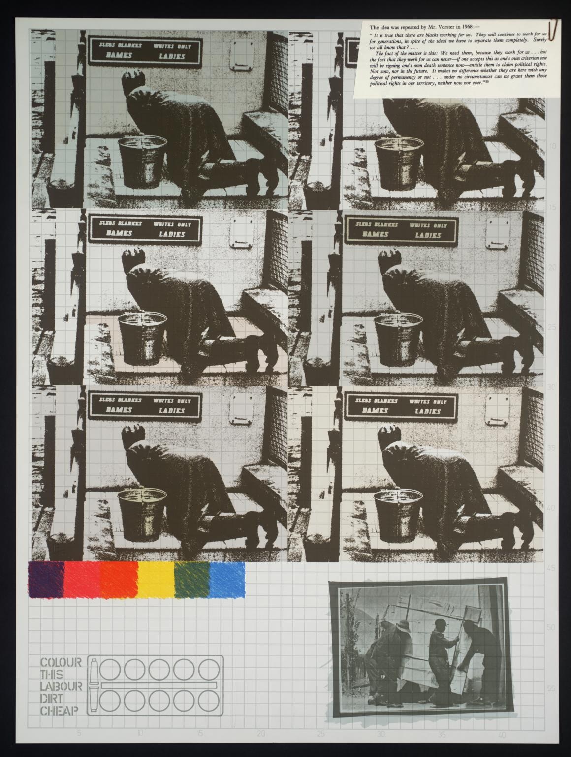 Artwork: Gavin Jantjes, Colour This Labour Dirt Cheap (A South African Colouring Book) (1974-5). Screenprint on card. 60.2 × 45.2 cm . Courtesy of Iziko South African National Gallery.